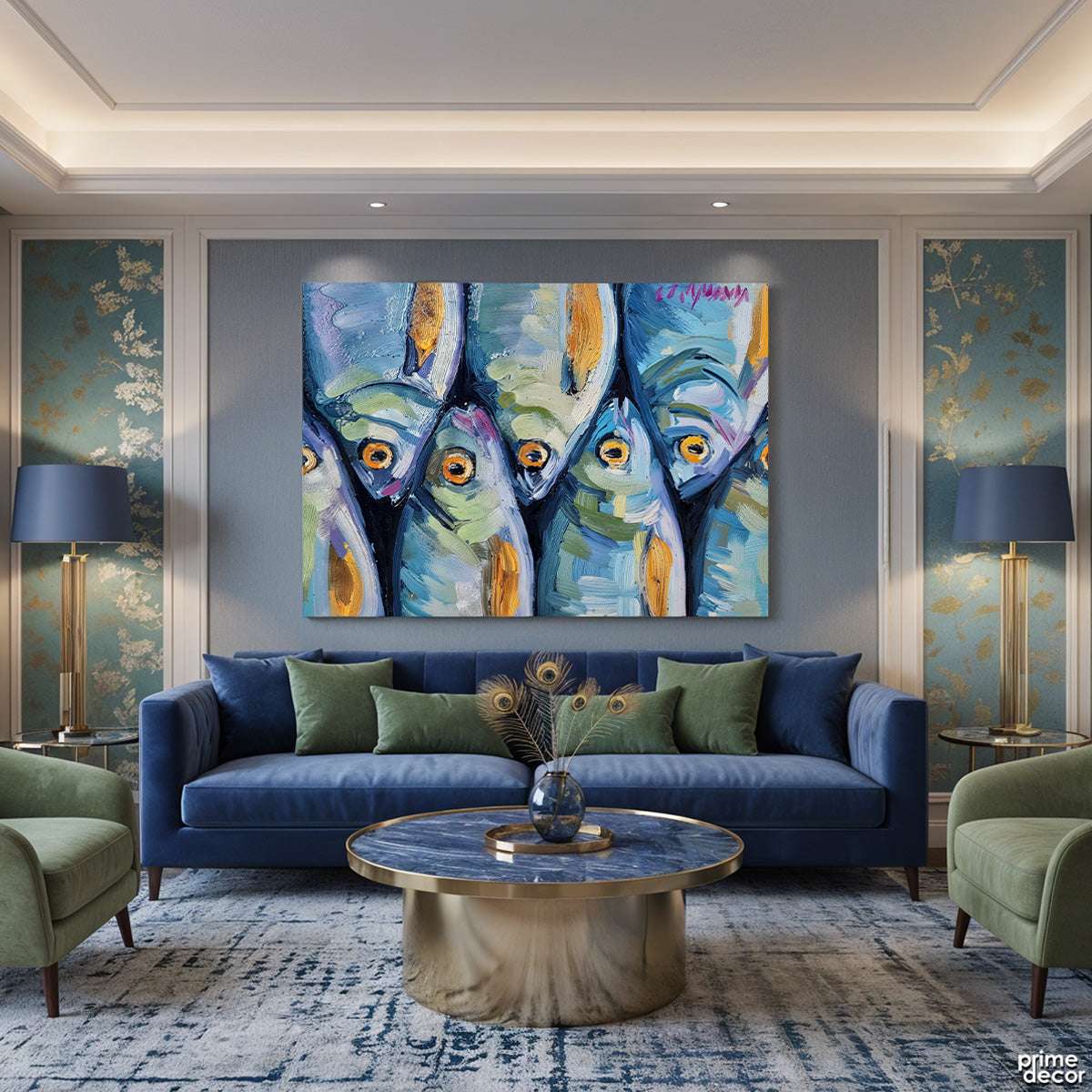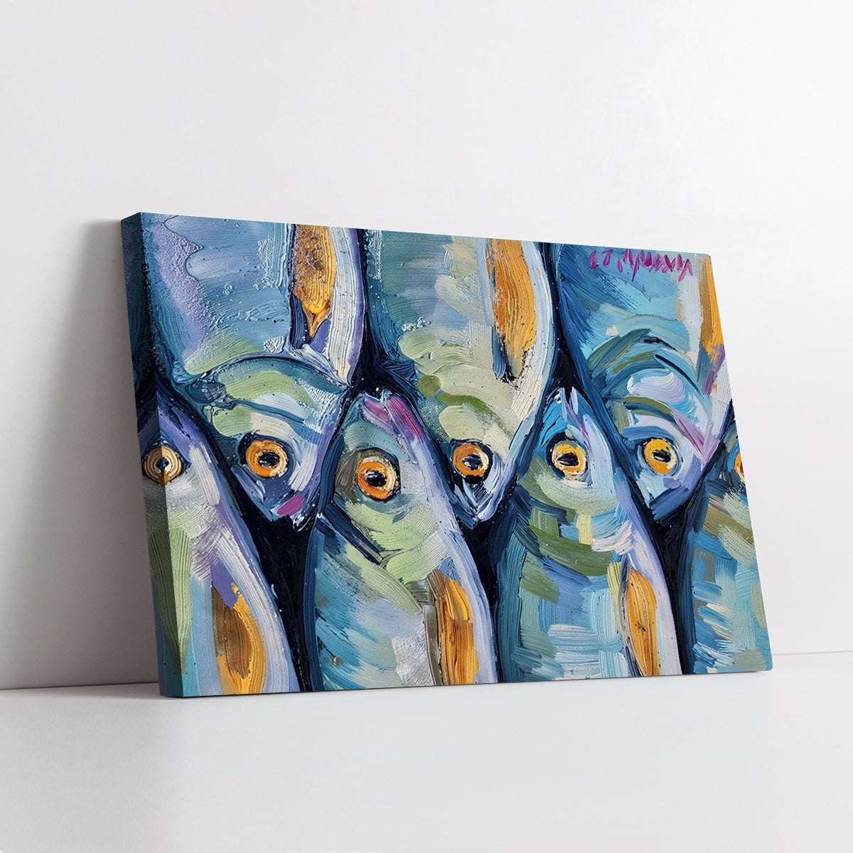 Textured School of Fish with Orange Eyes (Single Panel) Digital Painting Wall Art