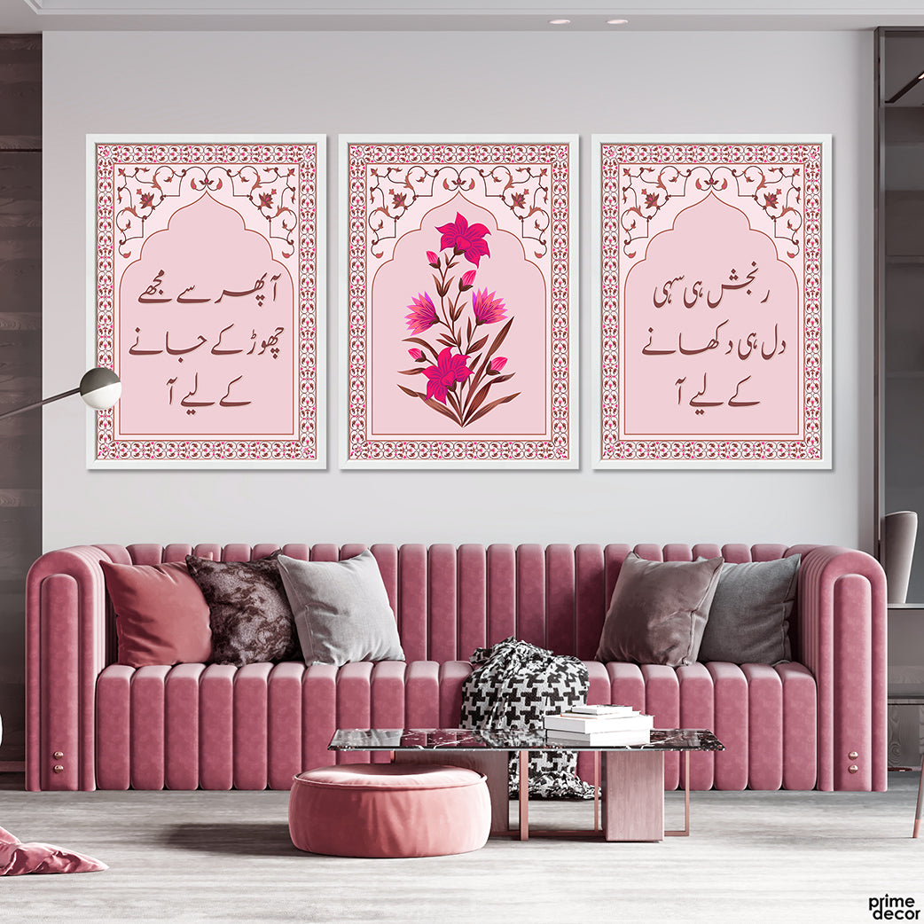 Ranjish Hi Sahi - Urdu Typography With Pink Floral Motive (3 Panel) Poetic Wall Art
