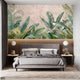 Green & Pink Exotic Leaves Artwork Over Beige Background | Floral Wallpaper Mural