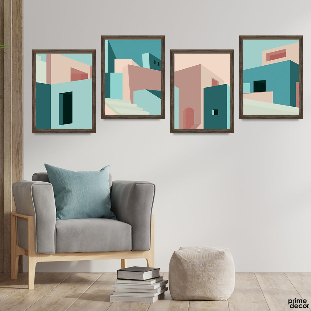 Abstract Buildings Art In Blue & Beige Color Shades (4 Panel) Nordic Wall Art