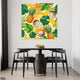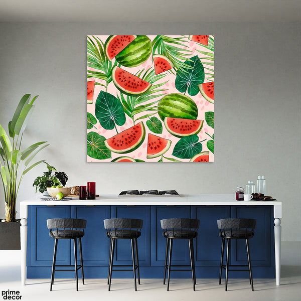 Watermelon With Green Leaves Over Pink Background (Single Panel) Square Wall Art