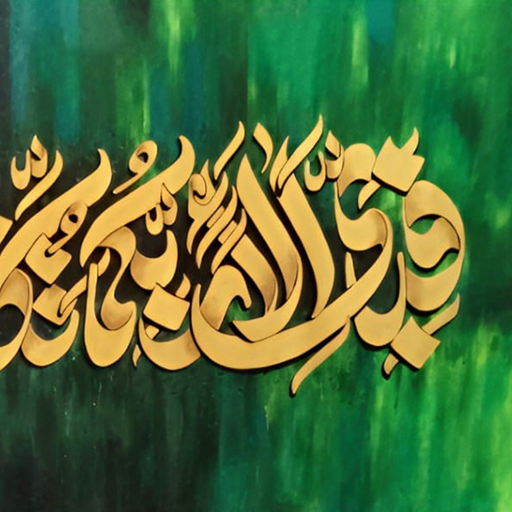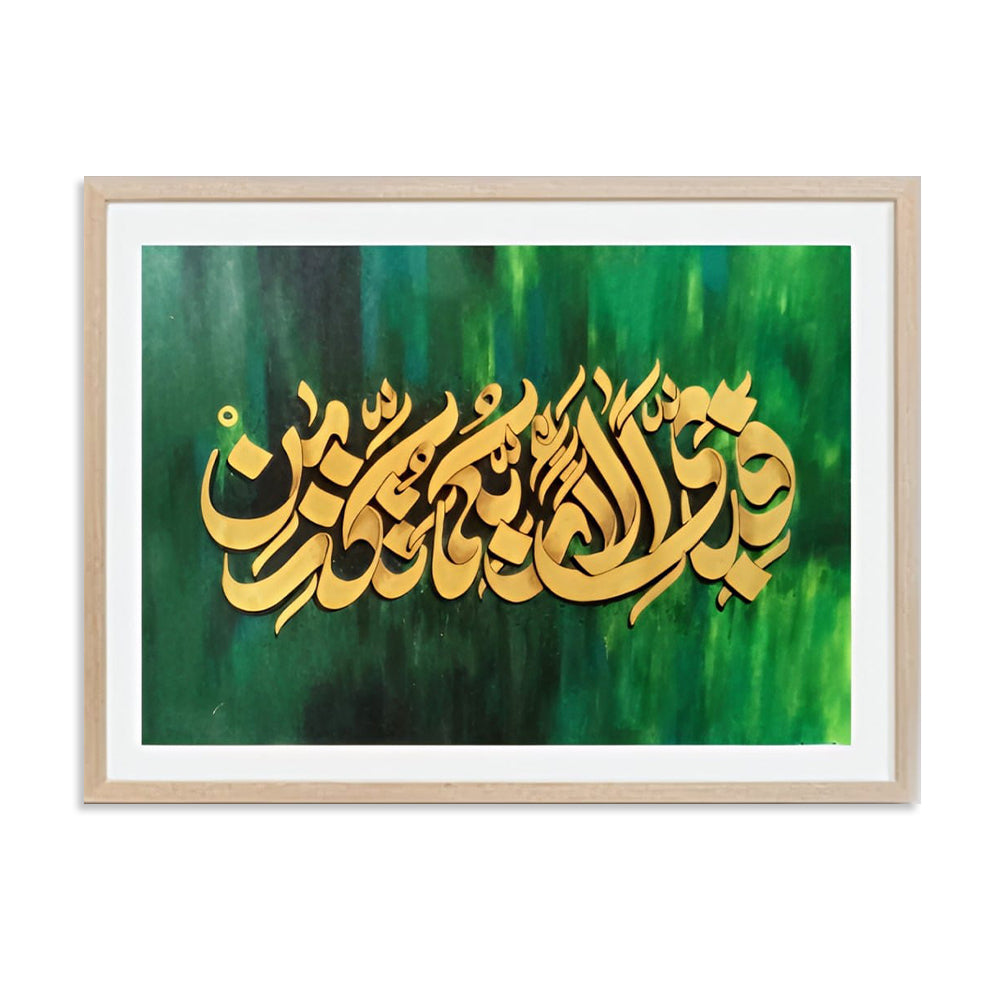 Fabi-ayyi Ala-i Rabbikuma Golden Calligraphy With Abstract Green Background| Handmade Painting