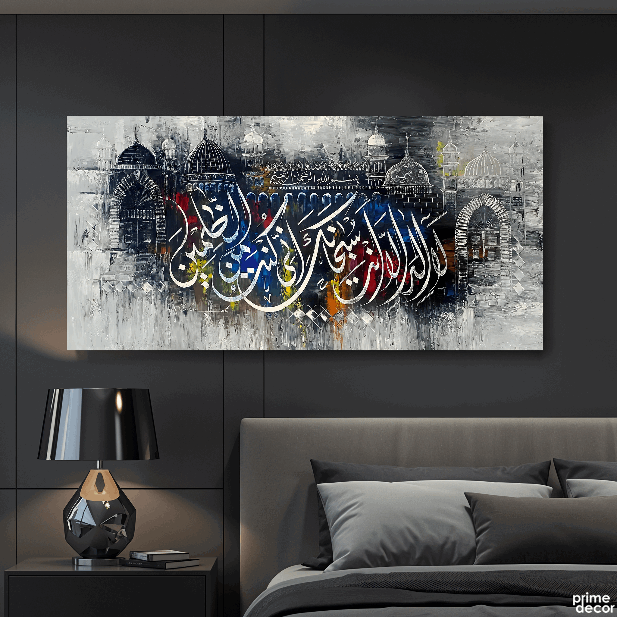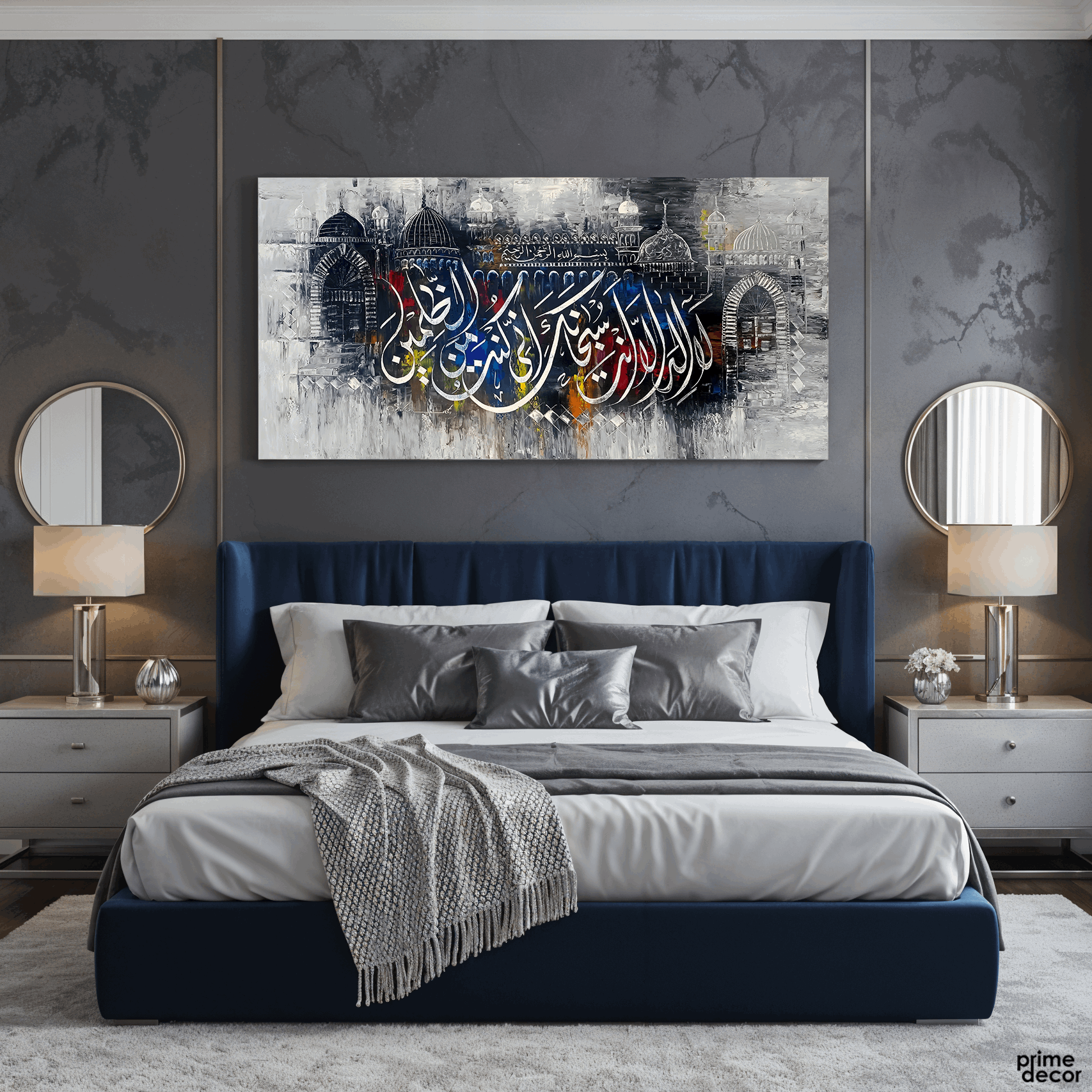 This striking artwork features the prayer of Prophet Yunus: "There is no god but You. Glory to You! I was indeed wrong." The vibrant calligraphy rests upon a solemn mosque silhouette.