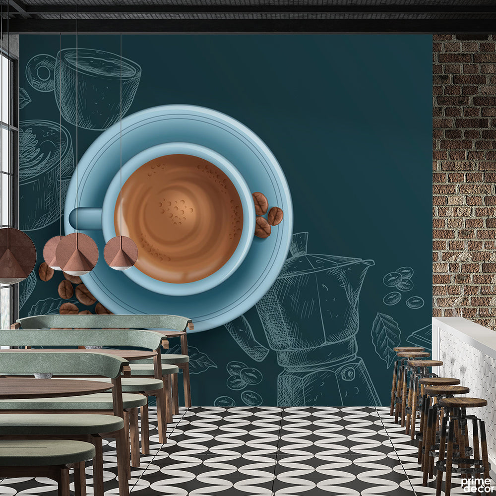 Beautiful Coffee Cup Artwork Over Green Background | Cafe Wallpaper Mural
