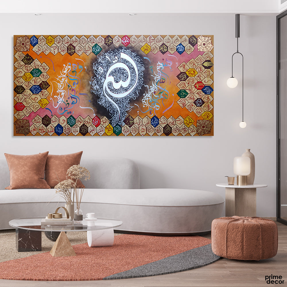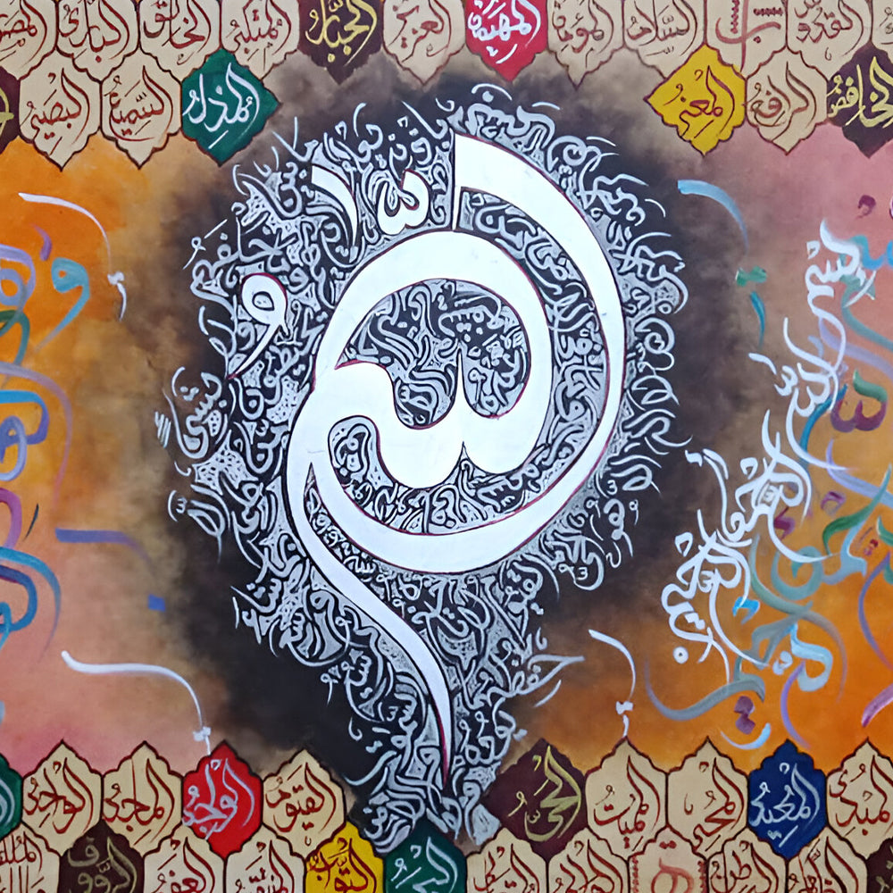 99 Names of Allah & Ayatul Qursi Calligraphy With Silver Leafing | Handmade Painting