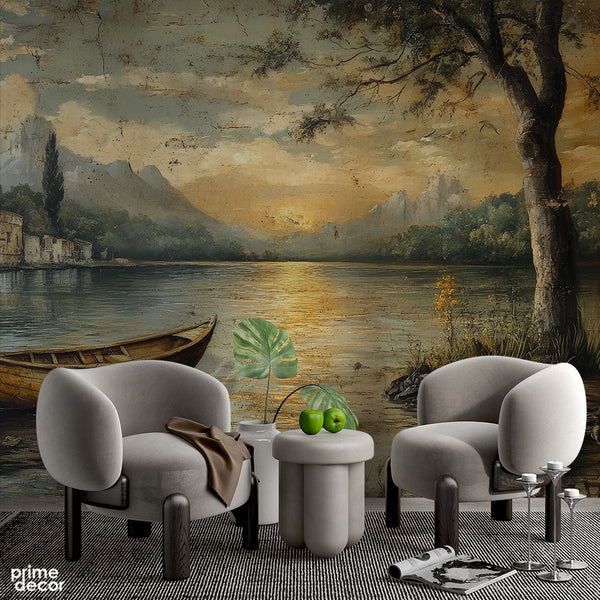 Abstract Artwork Of A Boat At Bank Of A River | Nature Wallpaper Mural