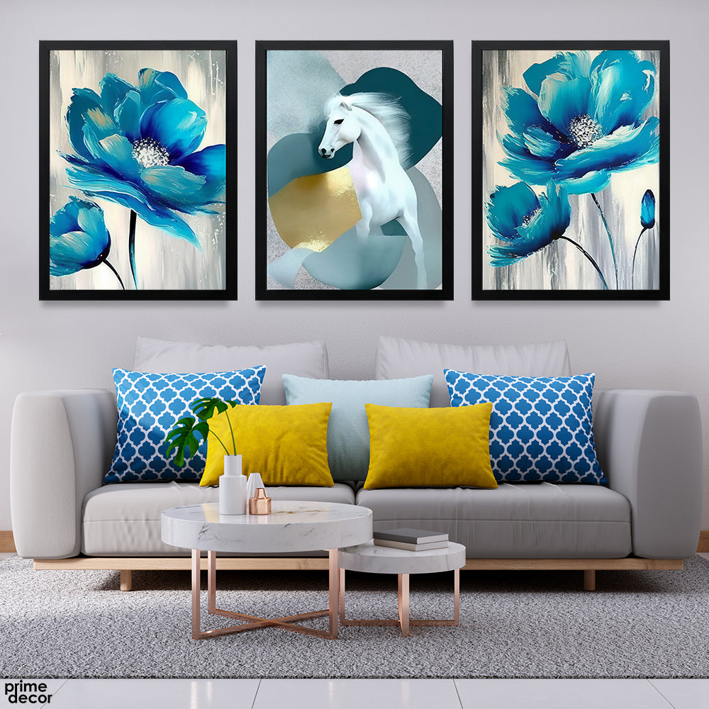 Abstract Blue & White Flowers With A Beautiful Horse (3 Panel) Nature Wall Art