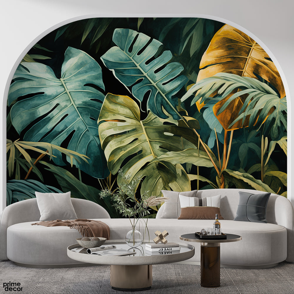 Abstract Green & Gold Exotic Leaves | Nature Wallpaper Mural
