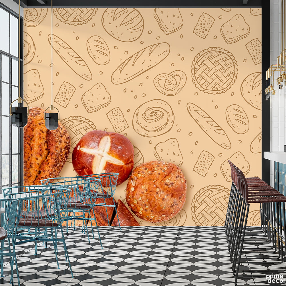 Abstract Pencil Artwork Of Food Over Beige Background | Restaurant Wallpaper Mural