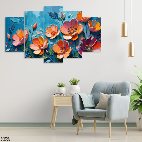 Aesthetic Orange & Red Flowers Over Blue Background (5 Panel) Floral Wall Art
