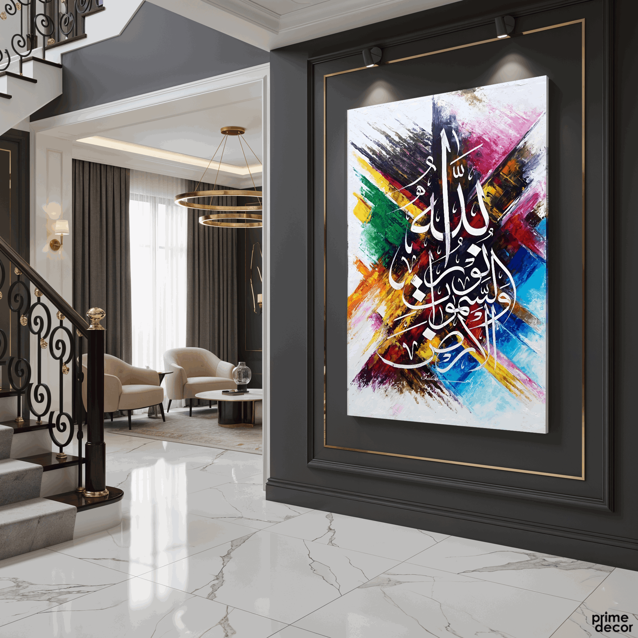 This powerful handmade painting features Ayat an-Nur: "Allah is the Light of the heavens and the earth," a profound verse celebrating Divine Light and guidance. The abstract canvas serves as an inspiring daily reminder of faith and illumination.