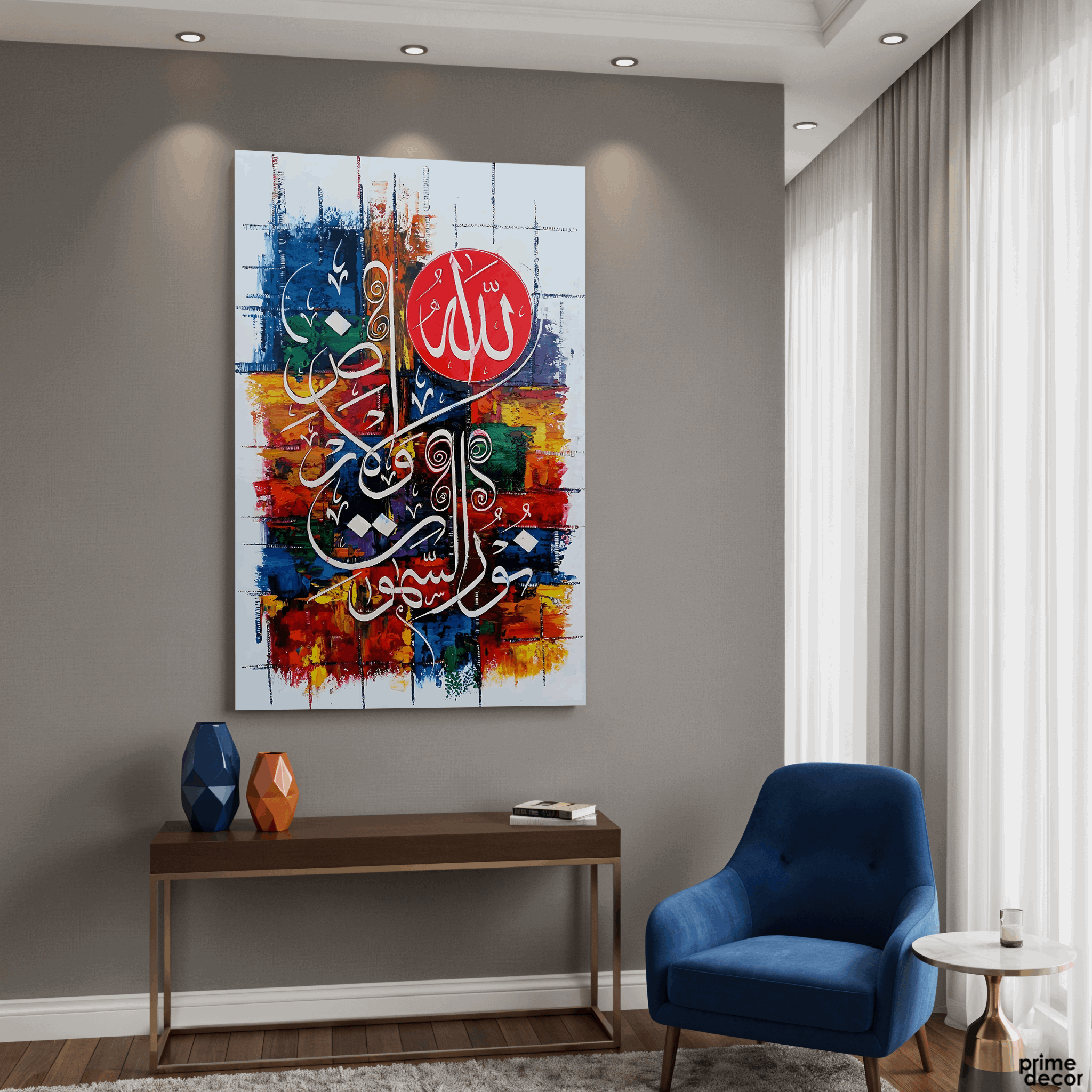 This powerful handmade painting features the Ayat an-Nur: "Allah is the Light of the heavens and the earth," rendered in bold abstract calligraphy over vibrant colors. The canvas serves as an inspiring daily reminder of Divine light and guidance.