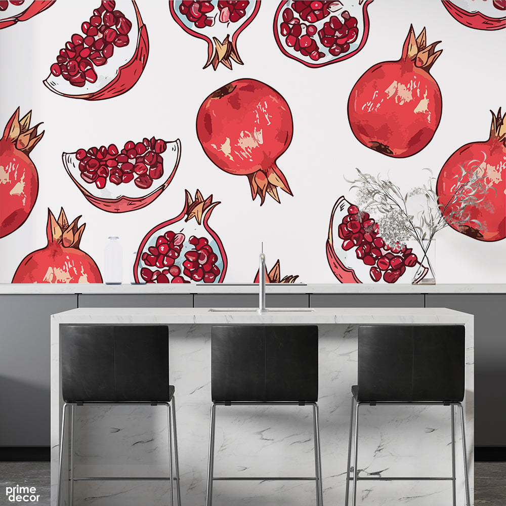 Beautiful Abstract Artwork Of Pomegranate Over White Background | Restaurant Wallpaper Mural