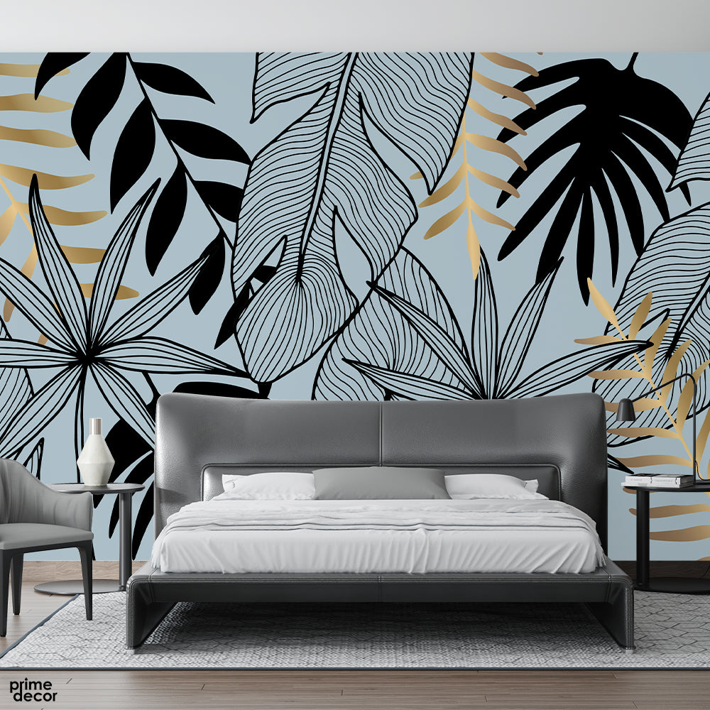 Beautiful Black & Gold Leaves Line Artwork | Floral Wallpaper Mural