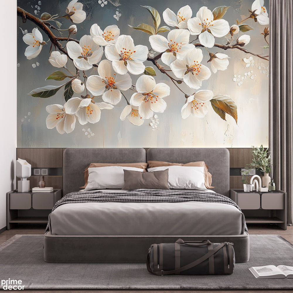 Beautiful Tranquil Beige Apple Blossom Flowers Artwork | Floral Wallpaper Mural