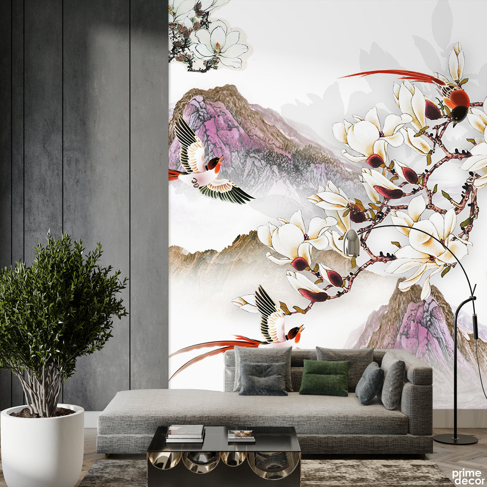 Beautiful Red & White Flowers With Flying Birds | Floral Wallpaper Mural