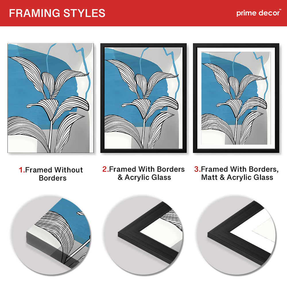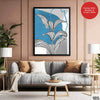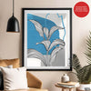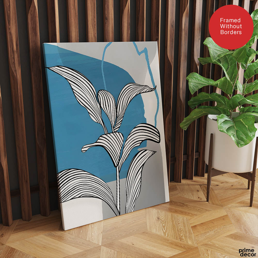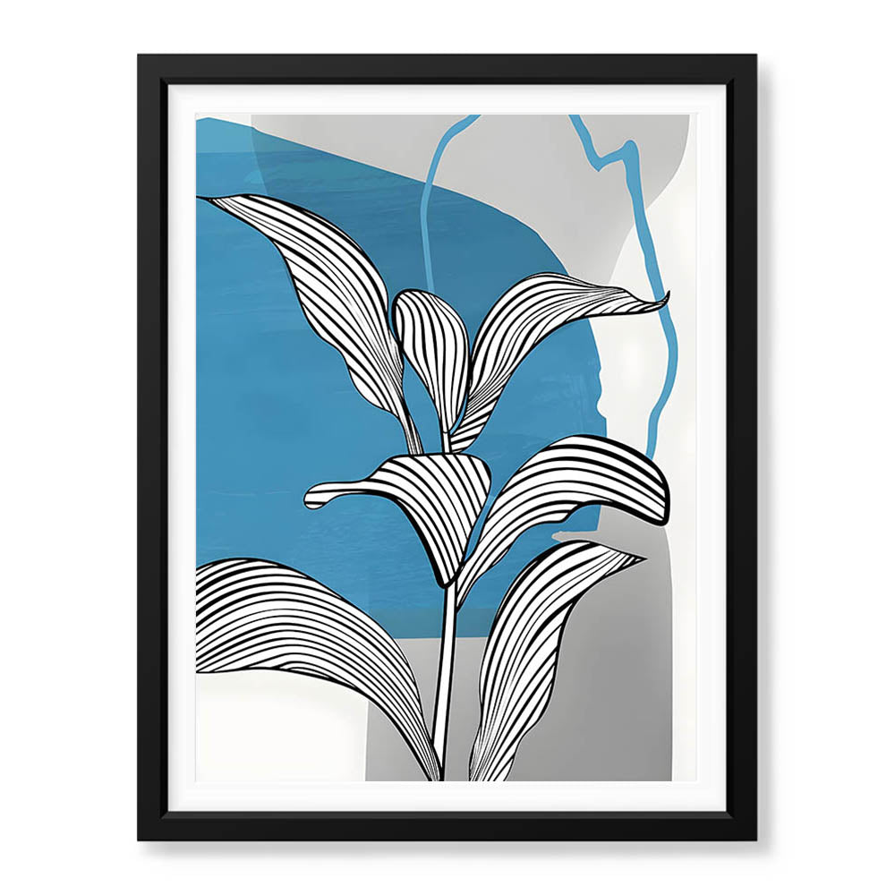 Black & White Tropical Leaves Over Blue & Grey Background| Abstract Floral Artwork #00207