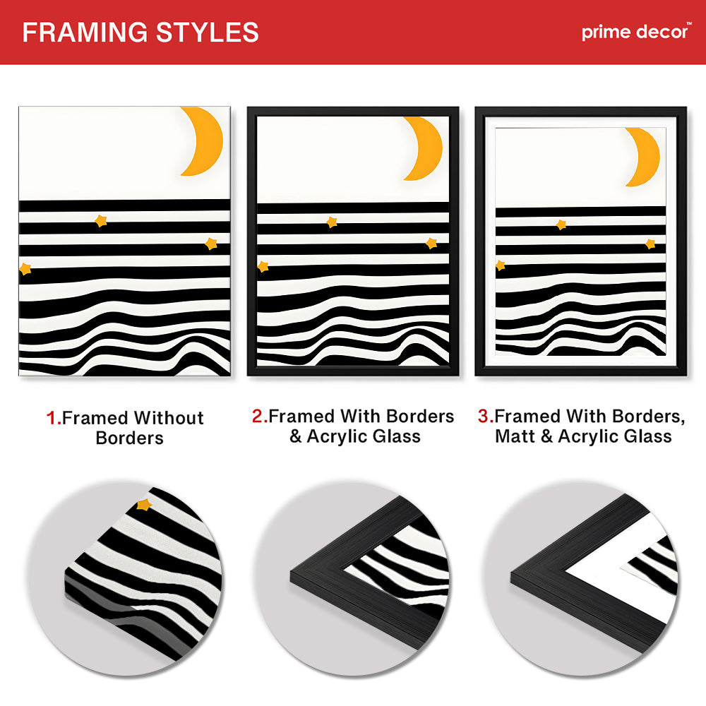 Black & White Waves Design With Gold Moon Over White Background| Abstract Nature Artwork #00212