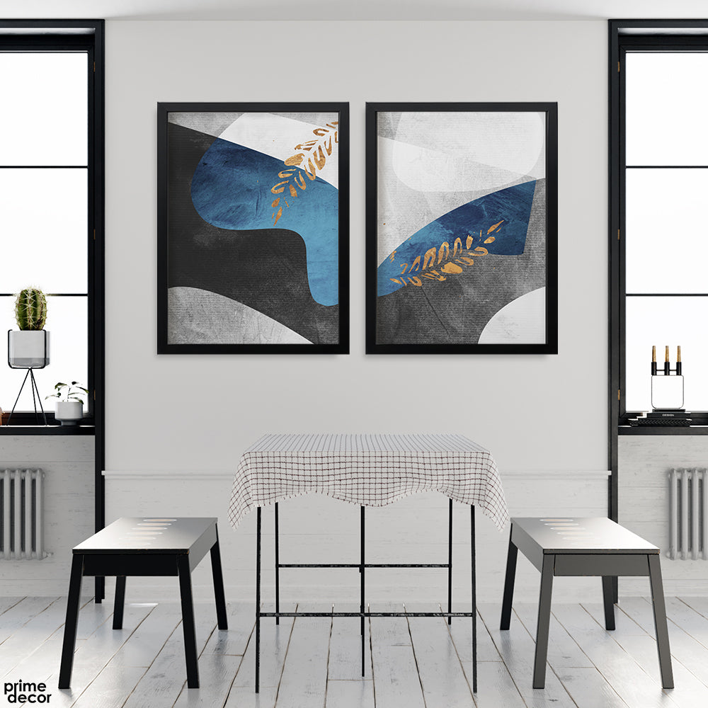 Blue & Charcoal Abstract Peaks with Gold Fern (2 Panel) Modern Wall Art