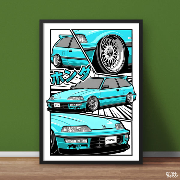 Blue Honda Civic CRX Modified Drawing Illustration | Cars Wall Art