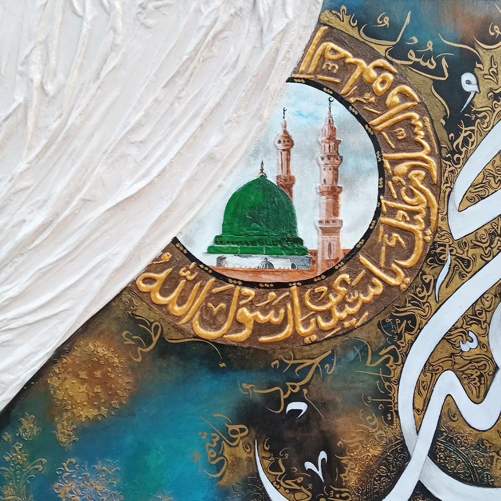 Darood Sharif Calligraphy With Masjid Nabvi Acrylic Embossed Style | Handmade Painting