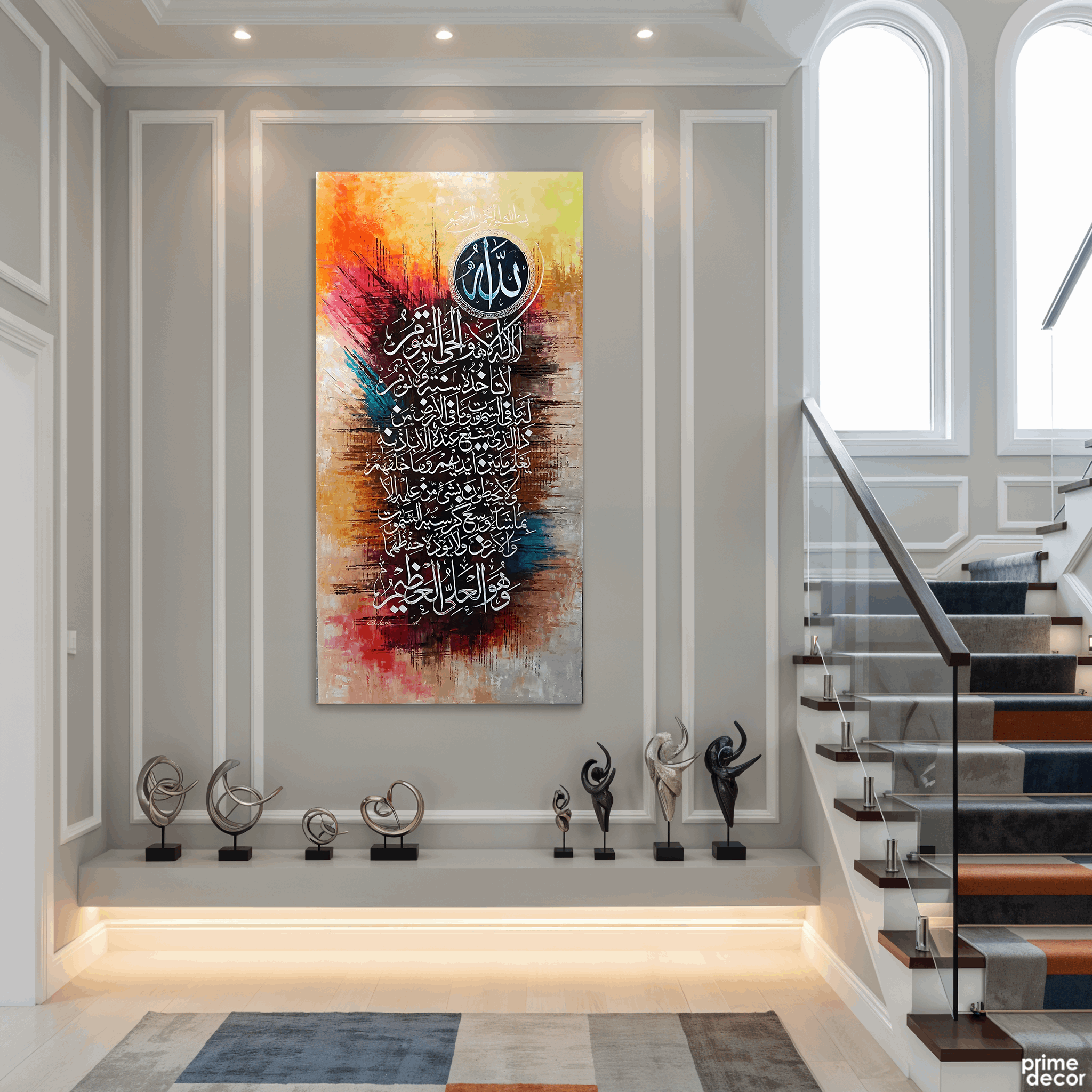 This powerful handmade painting features the entire Ayat al-Kursi: "Allah! There is no god but He, the Ever-Living, the Sustainer of existence..." The abstract canvas serves as an inspiring reminder of God's power and ultimate protection.