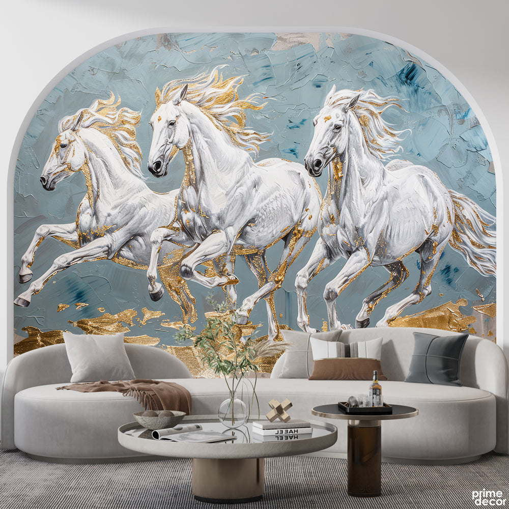 Galloping Steeds With Gold Leaf Accents & Textured Icy Blue Background | Opulent Animal Wallpaper Mural