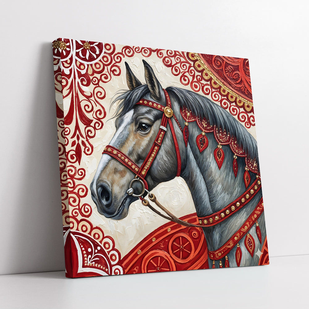 Grey Horse With Red Ornamental Bridle On Patterned Background (Single Panel) Digital Painting Wall Art