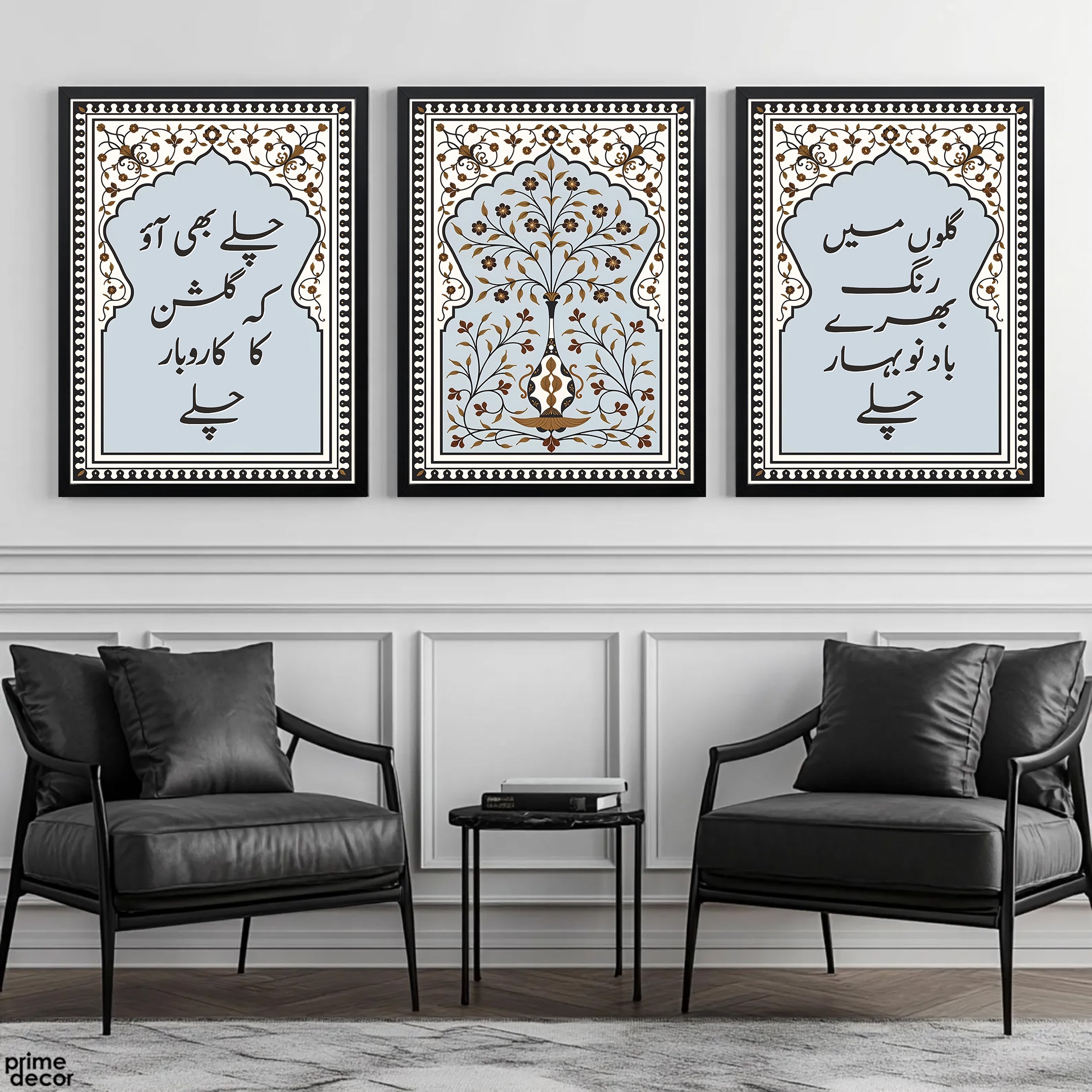 Gulon Mein Rang Bhare - Mehdi Hassan Urdu Typography Poetry (3 Panel) Poetic Wall Art