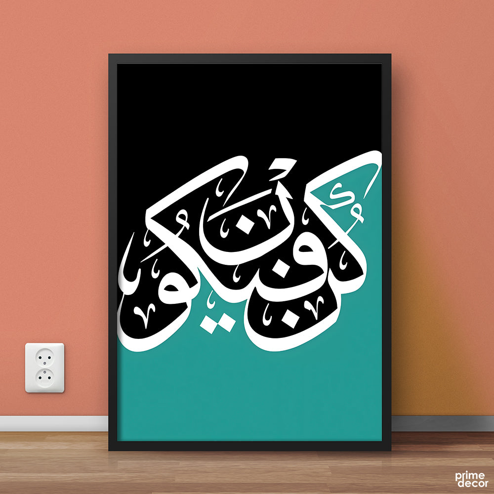 Kun Fayakun White Calligraphy On Teal Background | Poster Wall Art
