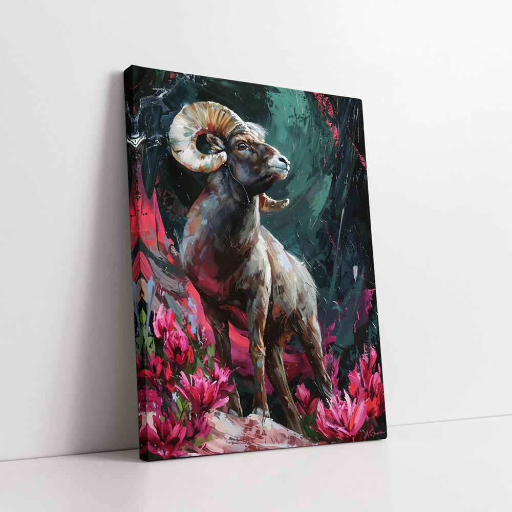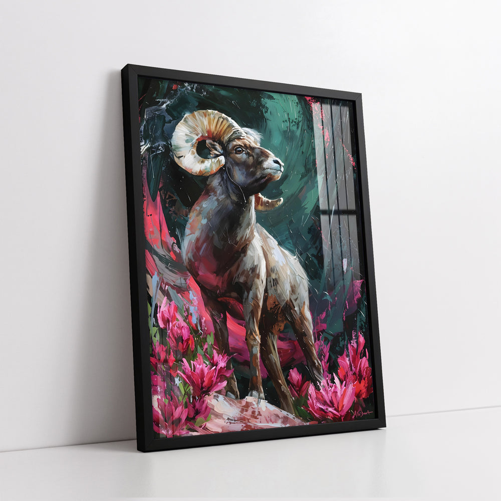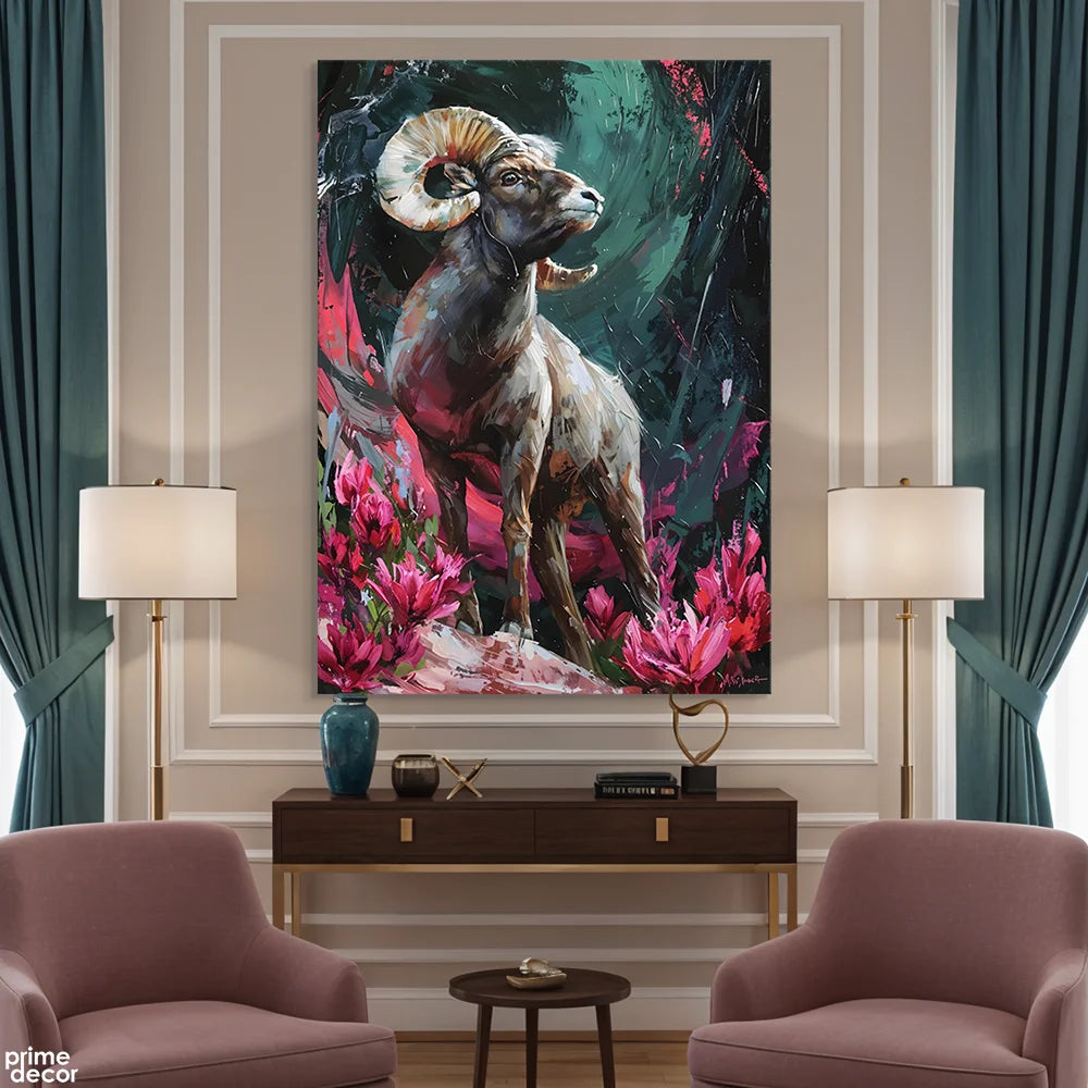 Majestic Bighorn Ram In Field Of Pink Flowers Impasto Style (Single Panel) Digital Painting Wall Art
