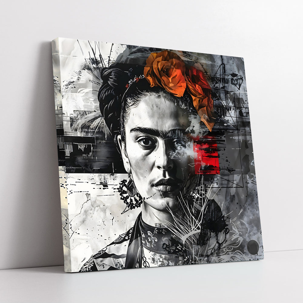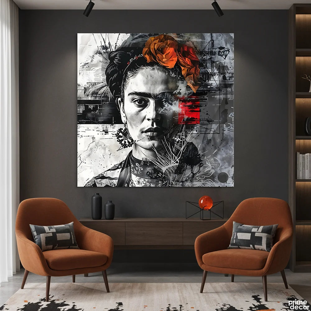 Modern Frida Kahlo Portrait With Orange Floral Crown Abstract Mixed Media (Single Panel) Digital Painting Wall Art