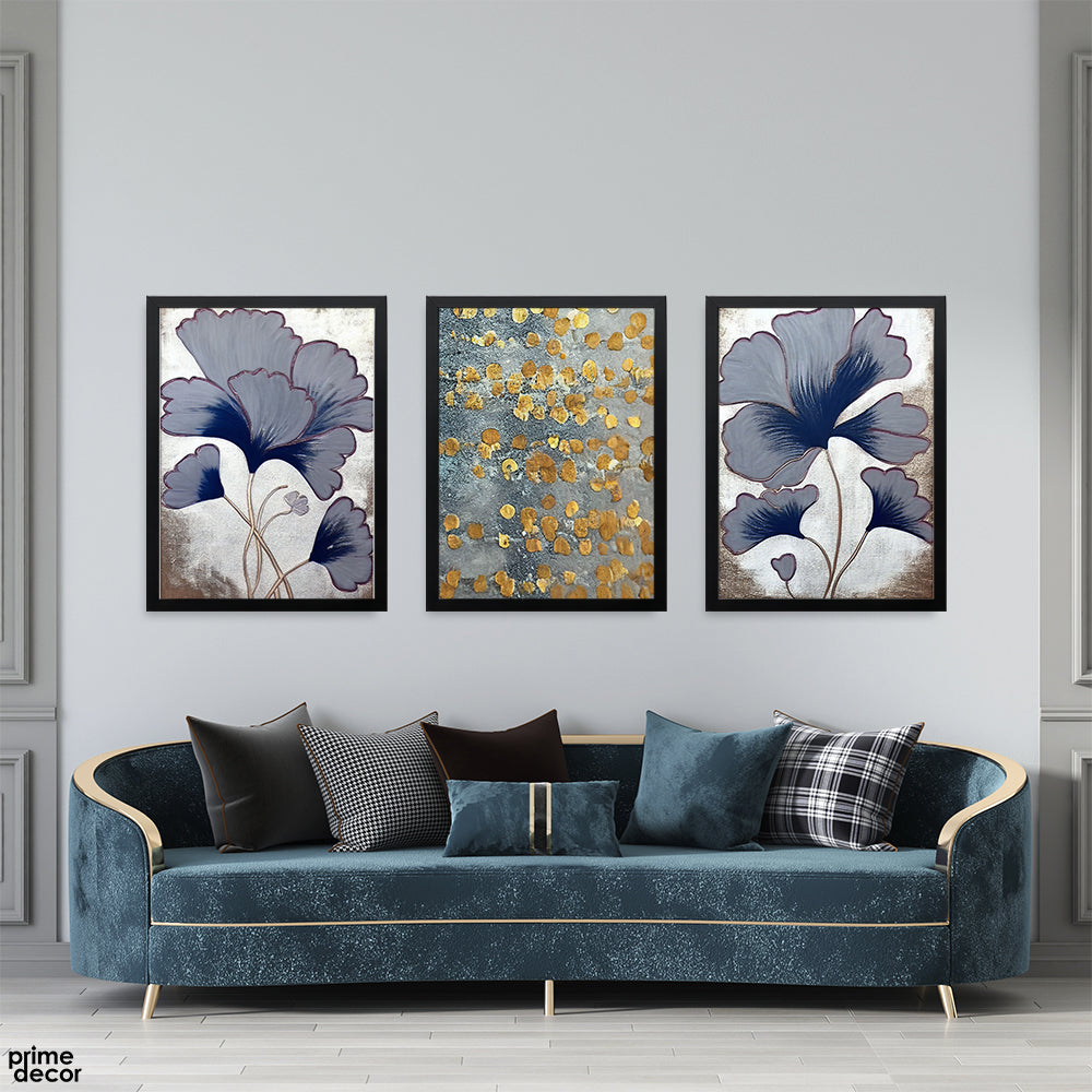 Navy & Gold Metallic Ginkgo Floral (3 Panel) Abstract Wall Art