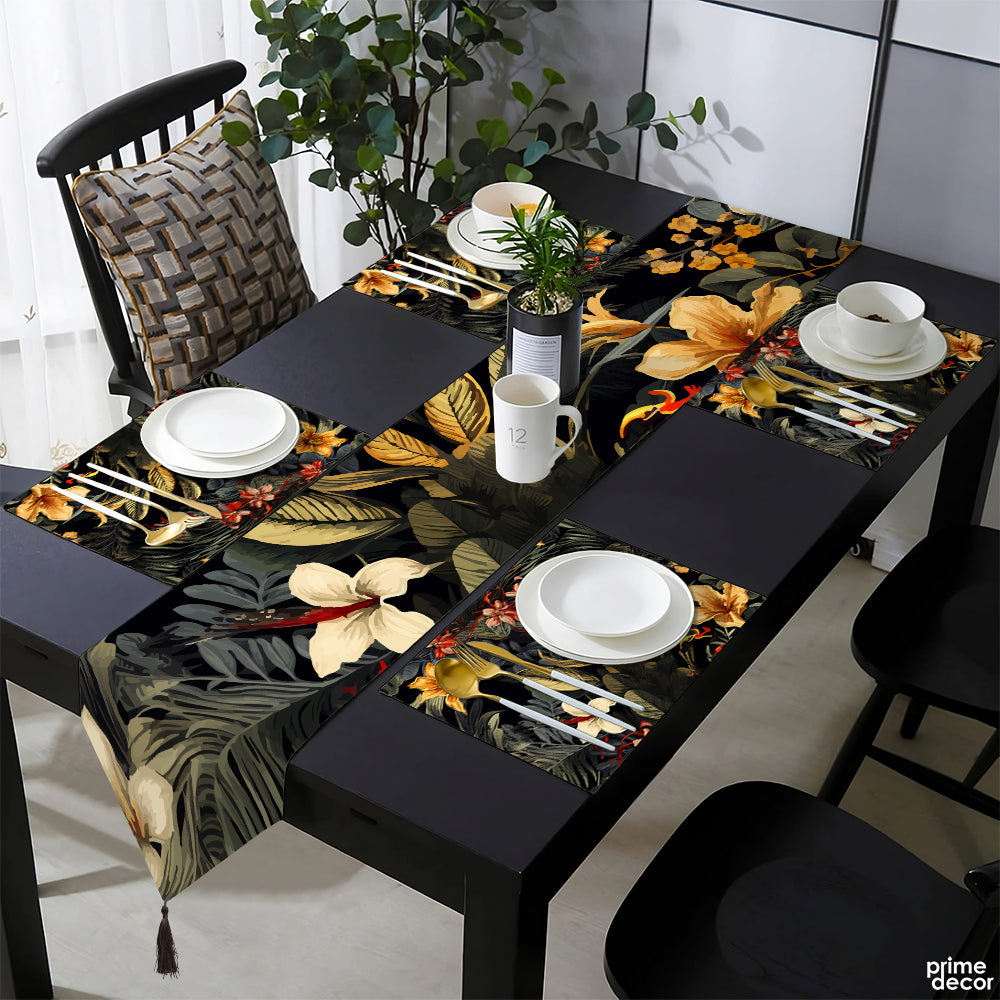 Peach & Gold Tropical Flowers On Black Background | Table Runner and Placemat Set