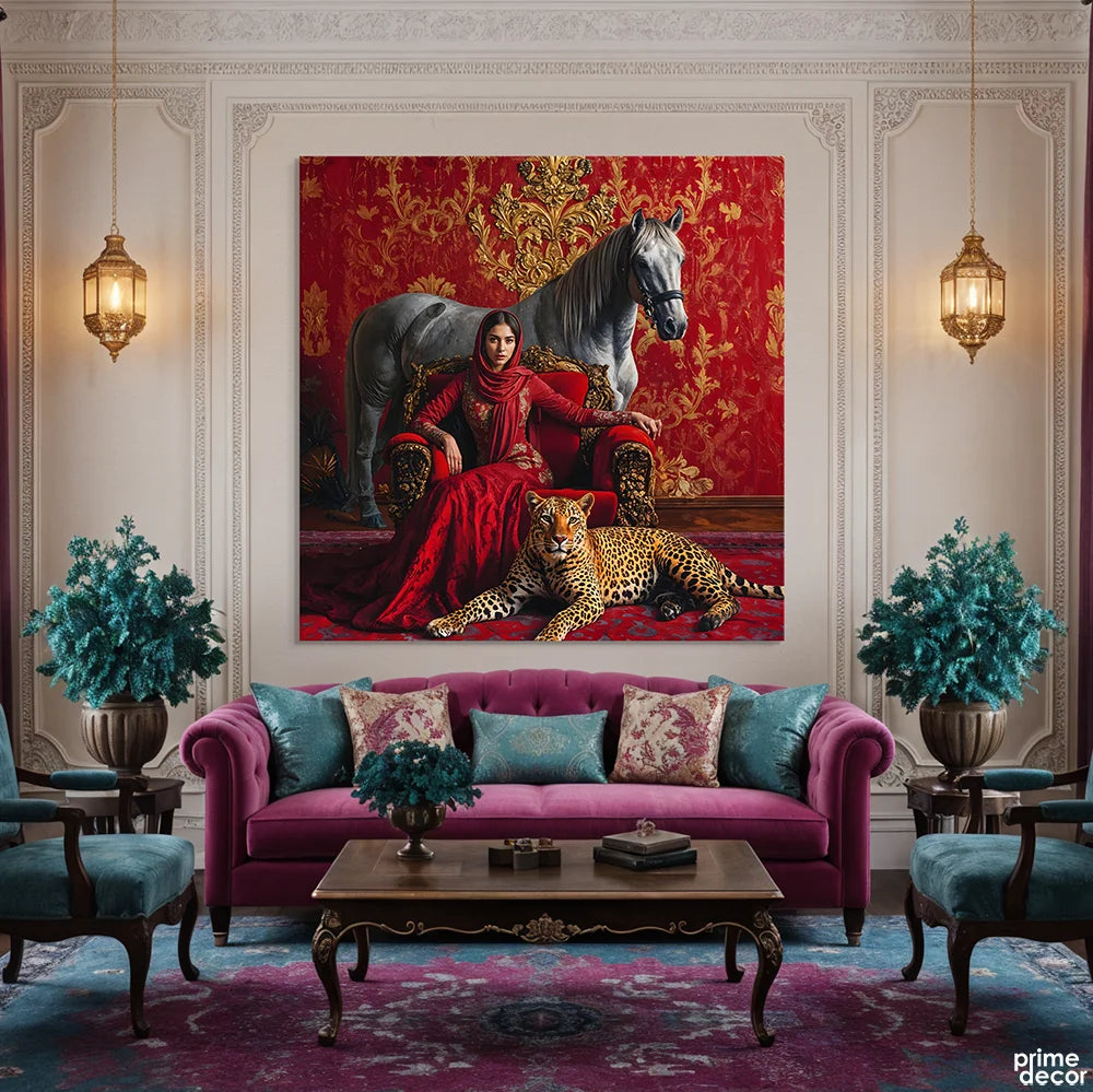 Royal Empress with White Stallion & Leopard in Red Velvet Room (Single Panel) Digital Painting Wall Art