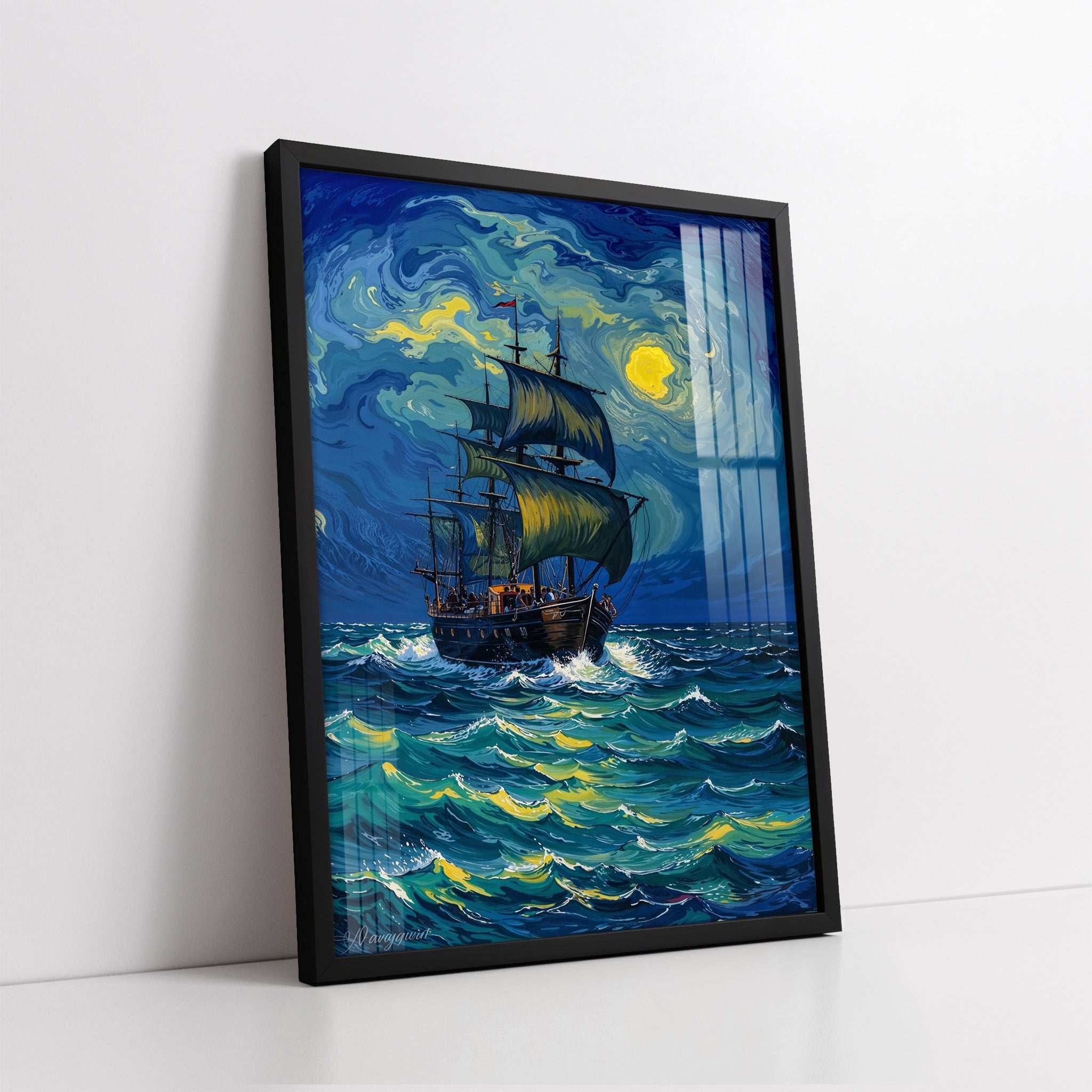 Sailing Ship on a Starry Night Style Ocean (Single Panel) Digital Painting Wall Art