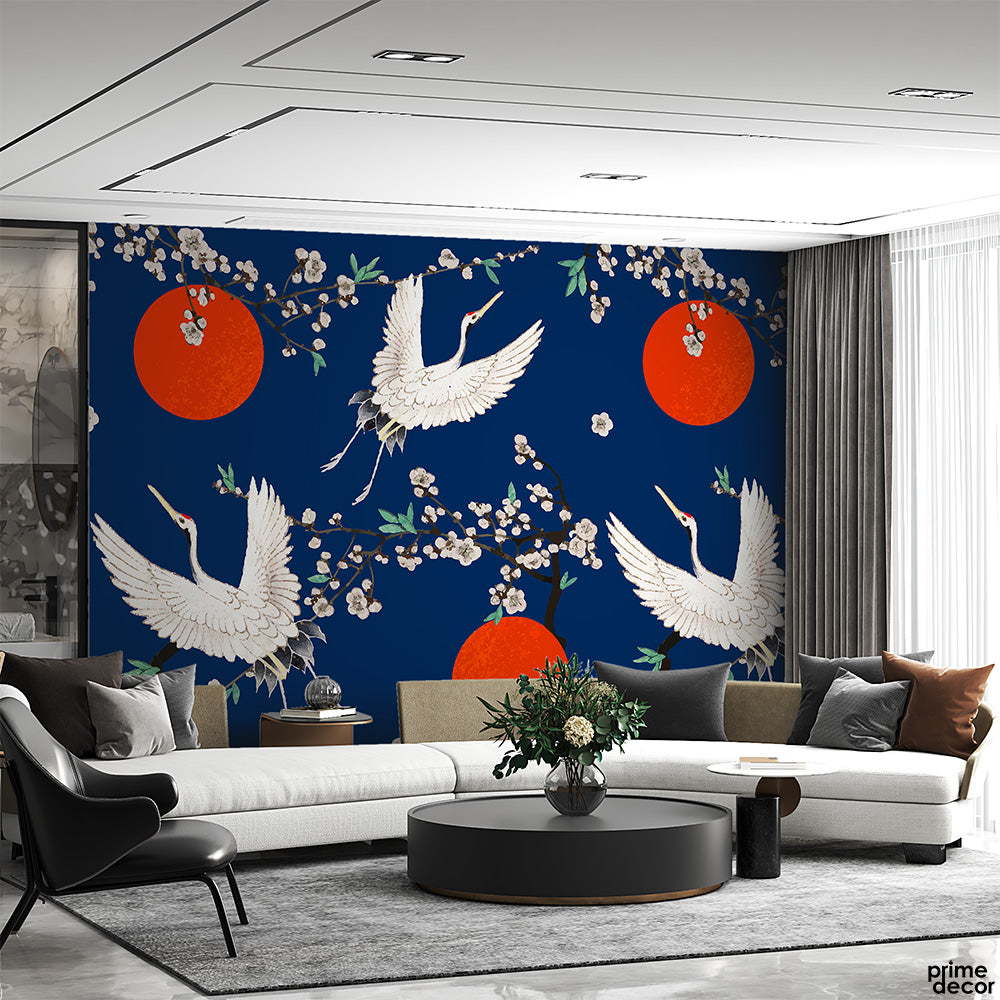 Sinopia Circles & White Cranes On Cyan Blue Background | Nordic Wallpaper Mural