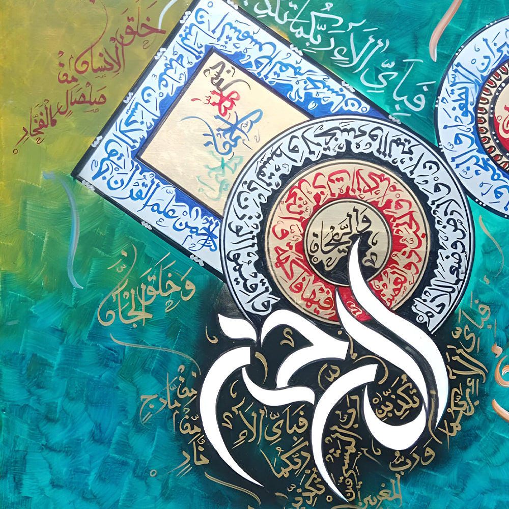 Surah Rahman Calligraphy on Blue Abstract Background | Handmade Painting