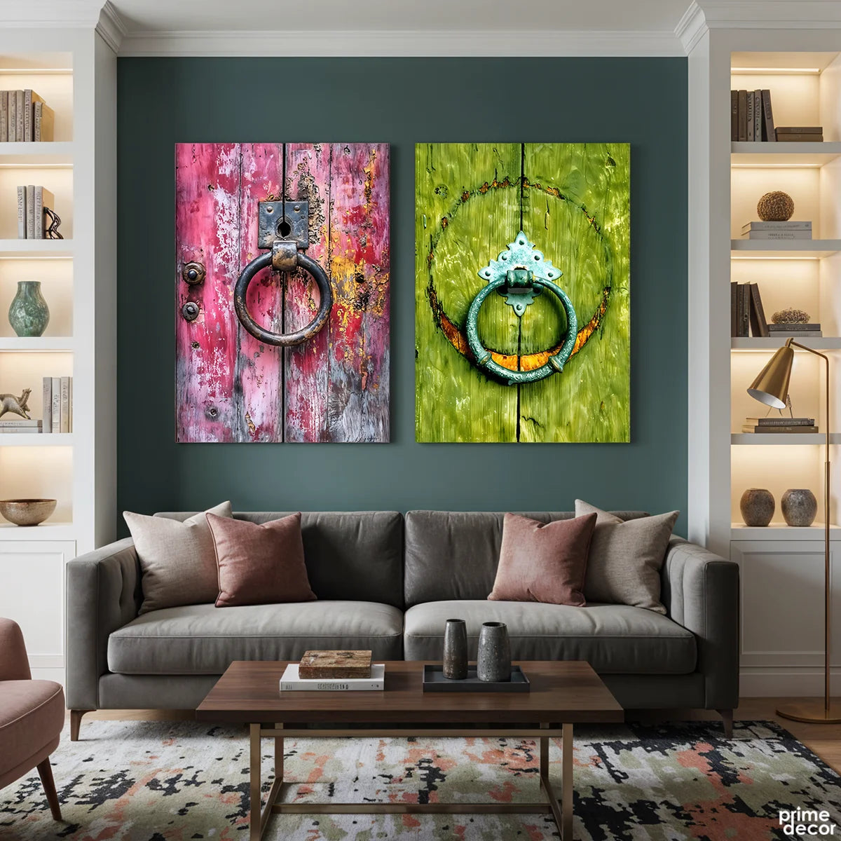 Vintage Door Knockers On Rustic Pink & Green Wooden Doors (Single Panel) Digital Painting Wall Art