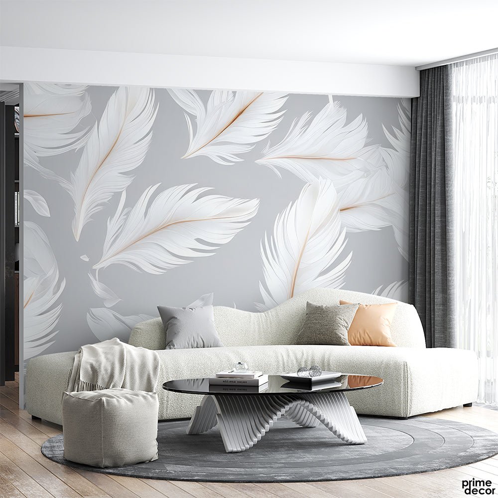 White Feathers On Quill Grey Background | Wallpaper Mural