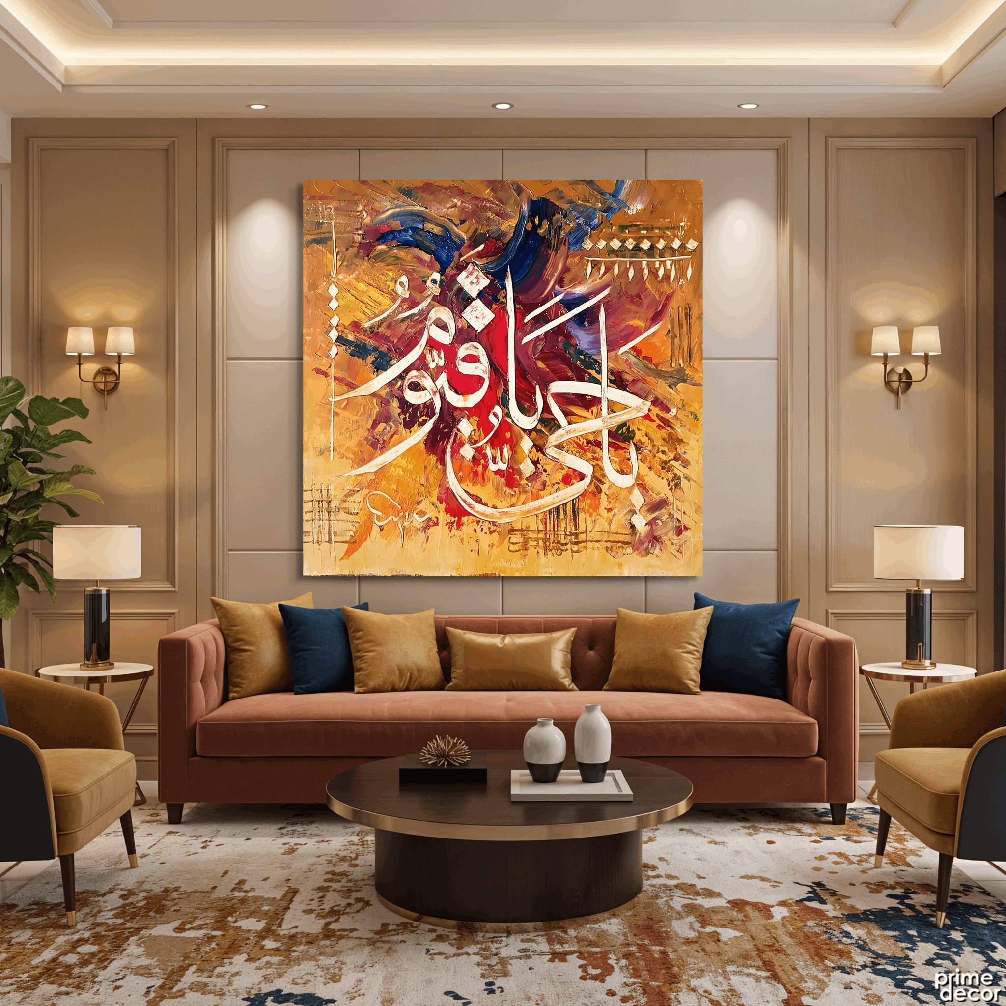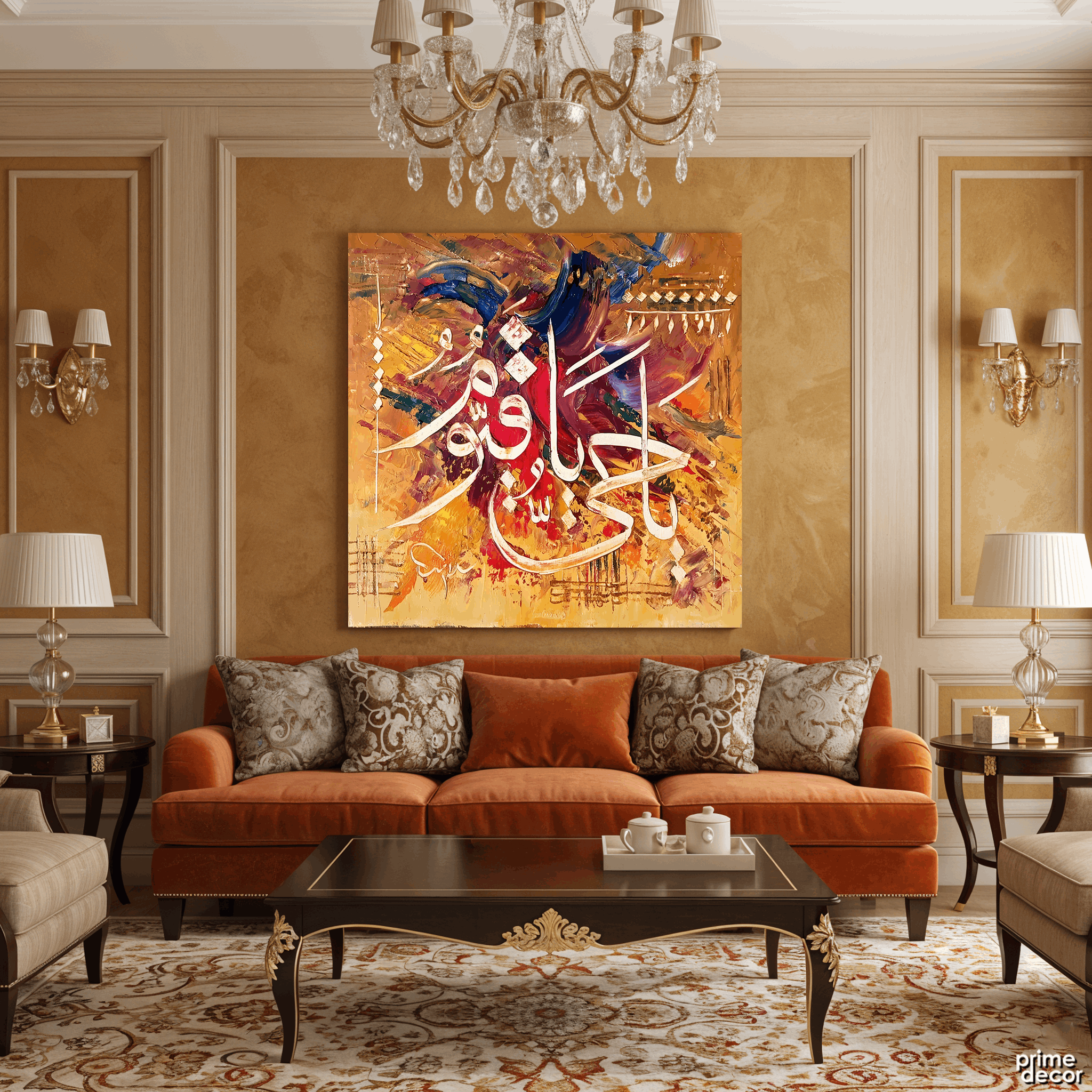 This powerful handmade painting features the sacred names of Allah, "Ya Hayyu Ya Qayyum": "O Ever-Living, O Sustainer of [all] existence." The abstract canvas serves as an inspiring daily reminder of God's power and reliance on His support.